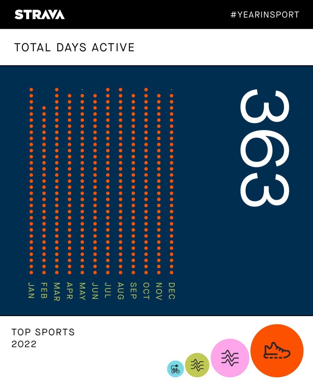 In 2022 I exercised 618 times, on 363 days, for 571 hours. That’s a daily average of 95 minutes and 1.7 workouts.