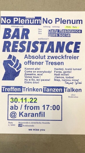 Kommt alle zum zweckfreien offen Tresen von 'Daily Resistance' am 30.11. ab 17 Uhr ins Karanfil nach #Neukölln. Für einen Abend übernimmt die Redaktion das Café, um gemeinsam zu tanzen, zu feiern und mit euch abzuhängen! #b3011 #DailyResistance #Newspaper