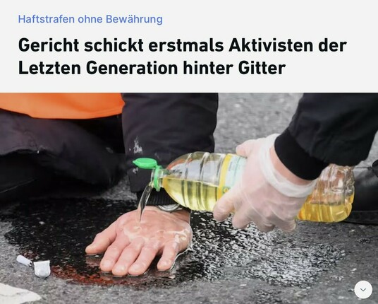 Einmal auf der Straße festkleben, zwei Monate OHNE Bewährung. Mit 300 km/h einen Menschen töten, zwei Jahre MIT Bewährung. Verhältnismäßigkeit mit einem dicken Fragezeichen.