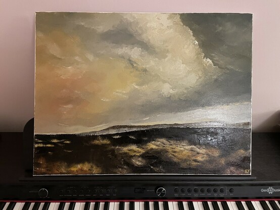 Colours of Dartmoor: oil on canvas, 18 x 24", with very many thanks to https://mastodon.art/@onlyindevon@mastodon.social for the reference photo. #oilpainting #landscape #Dartmoor #DartmoorCollective