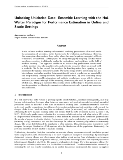 Unlocking Unlabeled Data: Ensemble Learning with the Hui-Walter Paradigm for Performance Estimation in Online and Static Settings