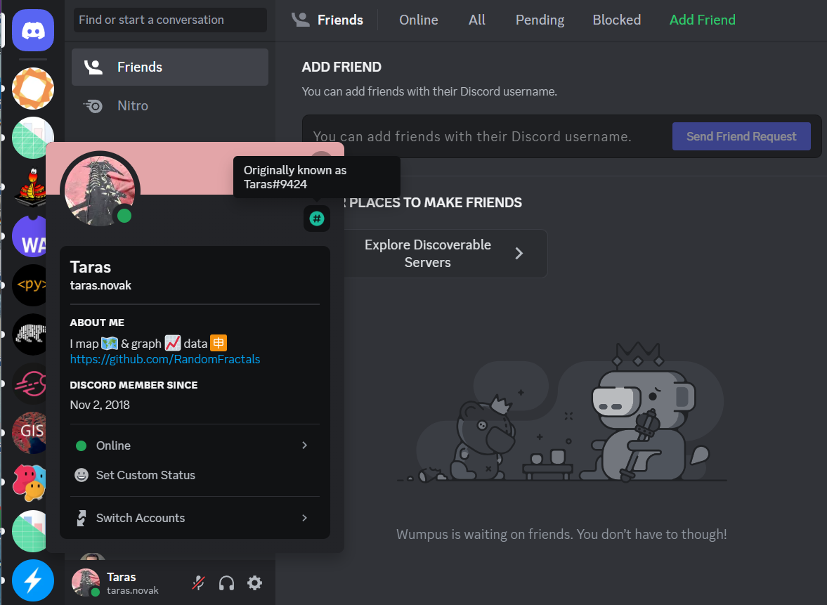 Set up new username on discord. You can friend and DM us there for quick chats about new #DataTools we are building, etc.