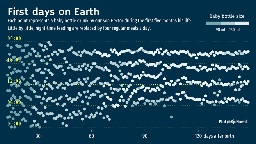 The relationship illustrated for #Day16 (family) of #30DayChartChallenge is the evolution of the regularity of meals as my son grew: from the chaos of the first months to 4 regular meals a day