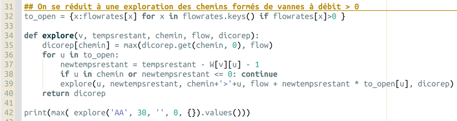 #Day16 Bon, ça m'avait fait très peur jusque là, mais en fait en prenant comme notion de chemin la suite des vannes ouvertes, en les explorant récursivement, en mémoïsant le score de chaque chemin, et en passant un chemin dès qu'il prend plus de 30 minutes ou revient sur ses pas, ça tombe très vite !