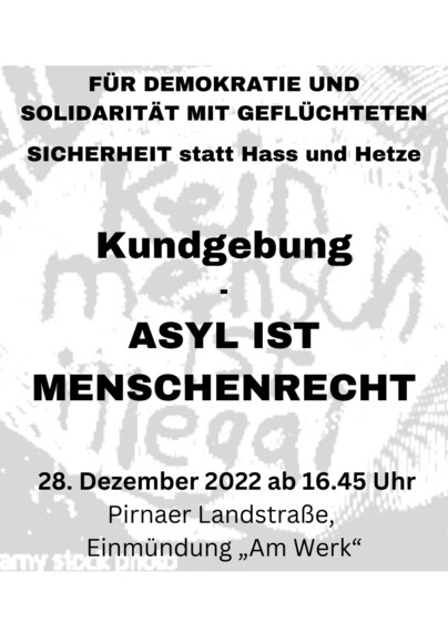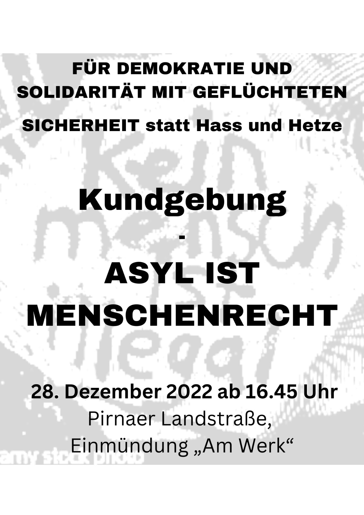 Laut Versammlungsportal ist am 28.12. eine Versammlung "Asyl ist Menschenrecht" in #Dresden-#Sporbitz angezeigt, um der rassistischen & von der lokalen extremen Rechten organisierten Demo etwas entgegenzusetzen.