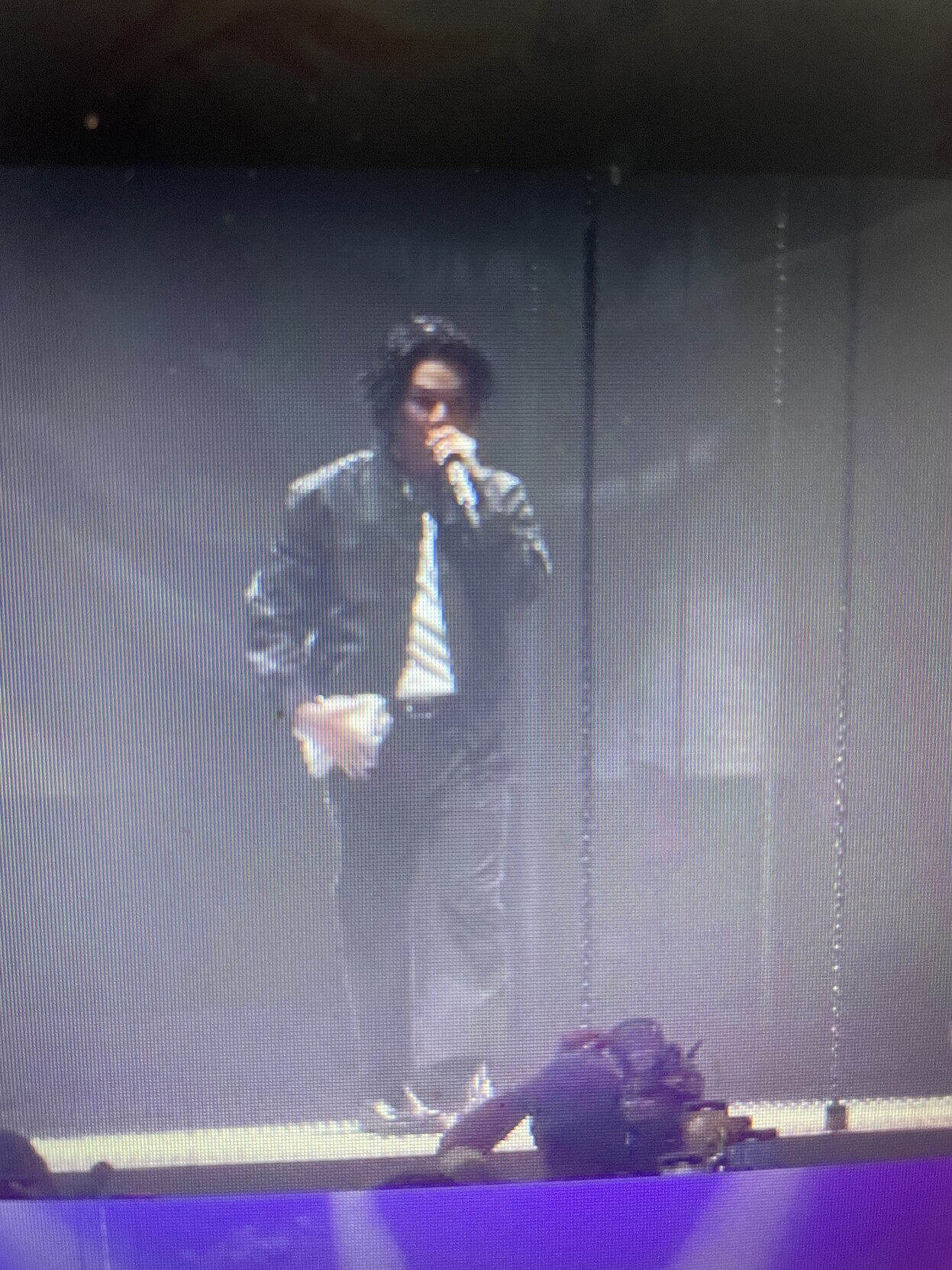 @lil_meow_meow Black Valentino jacket very similar to ones he’s worn before but without the custom D-Day lettering, white Tshirt with metal studs along the collar, black trousers with what looks like similar metal studs down the side seams #DDay