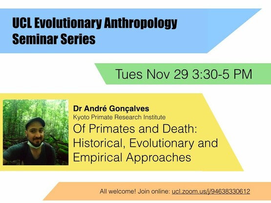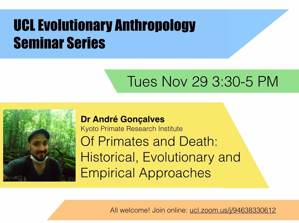Looking forward to this talk (online-accessible) on primates and death by Dr. Andre Goncalves, coming up on Tuesday 11/29. http://ucl.zoom.us/j/94638330612 #primates #death #grief #deathstudies #evolution #anthropology
