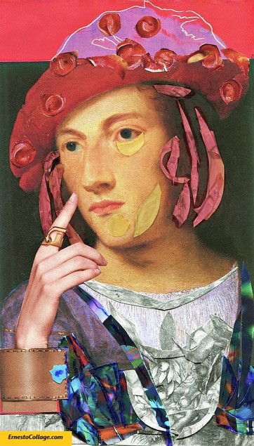 Youth in Red Cap. Handmade collage made from paper and watercolor, depicting a young man deep in thought.