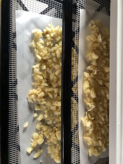 This year we had a bumper crop of garlic in our little garden 59 large bulbs of red Russians. 3-4 large cloves in each bulb. Chopped, dehydrated and ground most of it up for garlic powder. The rest was planted for next year. #food #cooking #preservation #dehydrator