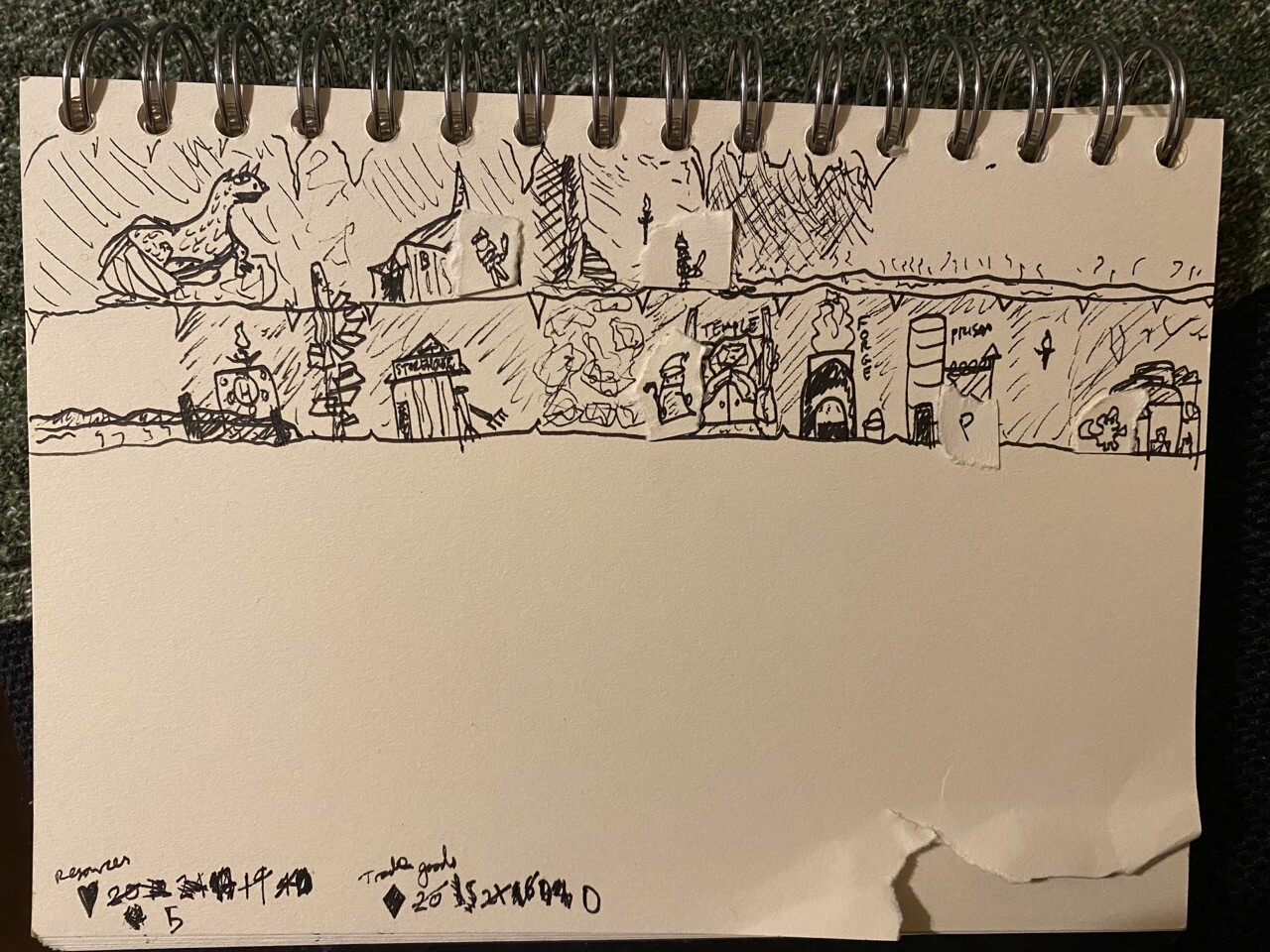 Day eight: We continued exploring west and found a cavern with some old but sound lumber. We gratefully added it to our depleted supplies. Before we could go any further a screeching and shrieking behind us made it clear that another foul creature had made its way through the portal. The adventurer who has taken up residence in our inn met the creature and held it while our troops finished it off. We’ve been lucky so far but we worry that something worse awaits us.