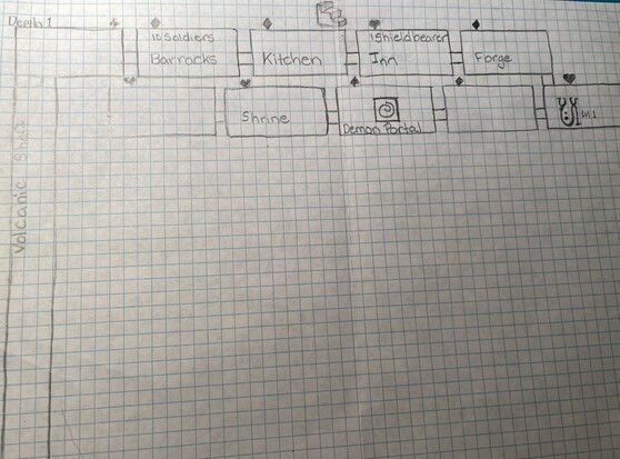 Day Three: We continued to explore to the east but immediately met a dead end at a dormant volcanic shaft. We were all a little unsettled staring into the seemingly endless darkness. We turned back east, through the barracks and kitchen, and found another pleasant and usable cavern. We built an inn and soon had attracted an adventurer, who sat at a table in a darkened corner. It’s comforting to have some extra muscle on hand even if he’s not terribly sociable. #Delve #SoloRPG