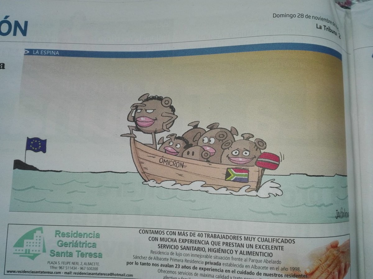 Esta viñeta tan racista y zafia apareció el domingo en @TribunaAlbacete@twitter.com . Pregunto al dibujante, @JaviSaladoo@twitter.com , ¿Te parece gracioso ? No le veo la gracia por ningún lado, ¡incitas al odio! #denunciasocial @StopracismoEsp@twitter.com @sosracismo@twitter.com @sosrefugeesmsf@twitter.com @RefugeesWelcome@twitter.com