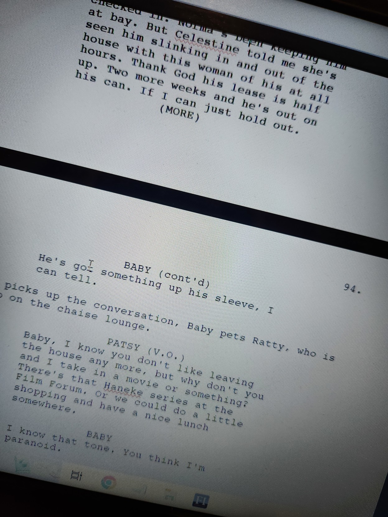 (By the way, I am using Fade In as my screenwriting software and I absolutely recommend it.)