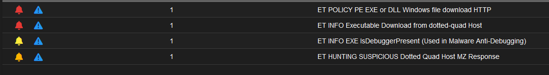 It feels so good having a functioning lab again. #Suricata rules started firing after I launched a Python server and downloaded a PE file. At some point I'll learn #YARA but for now network logs are good enough.