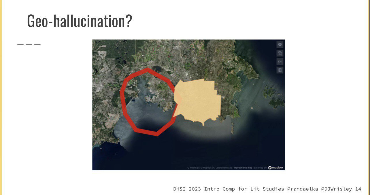 Geo-hallucination? A geojson polygon file created by #chatgpt (24 May version) for the city limits of #victoria BC (red) vs city opendata of the same https://opendata.victoria.ca/datasets/VicMap::city-boundary/explore?location=48.440729%2C-123.359375%2C11.90 (yellow) #DHSI