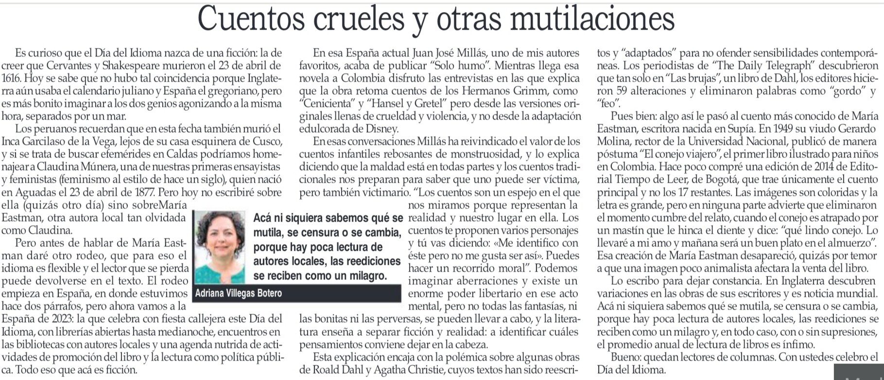 Hoy es el #DíaDelIdioma y escribí en La Patria sobre Juan José Millás, a quien leo con deleite, sobre la atrocidad de editar y edulcorar los libros de Roald Dahl y Agatha Christie, y sobre una escritora colombiana a la que le hicieron lo mismo. https://www.lapatria.com/opinion/columnistas/adriana-villegas-botero/cuentos-crueles-y-otras-mutilaciones