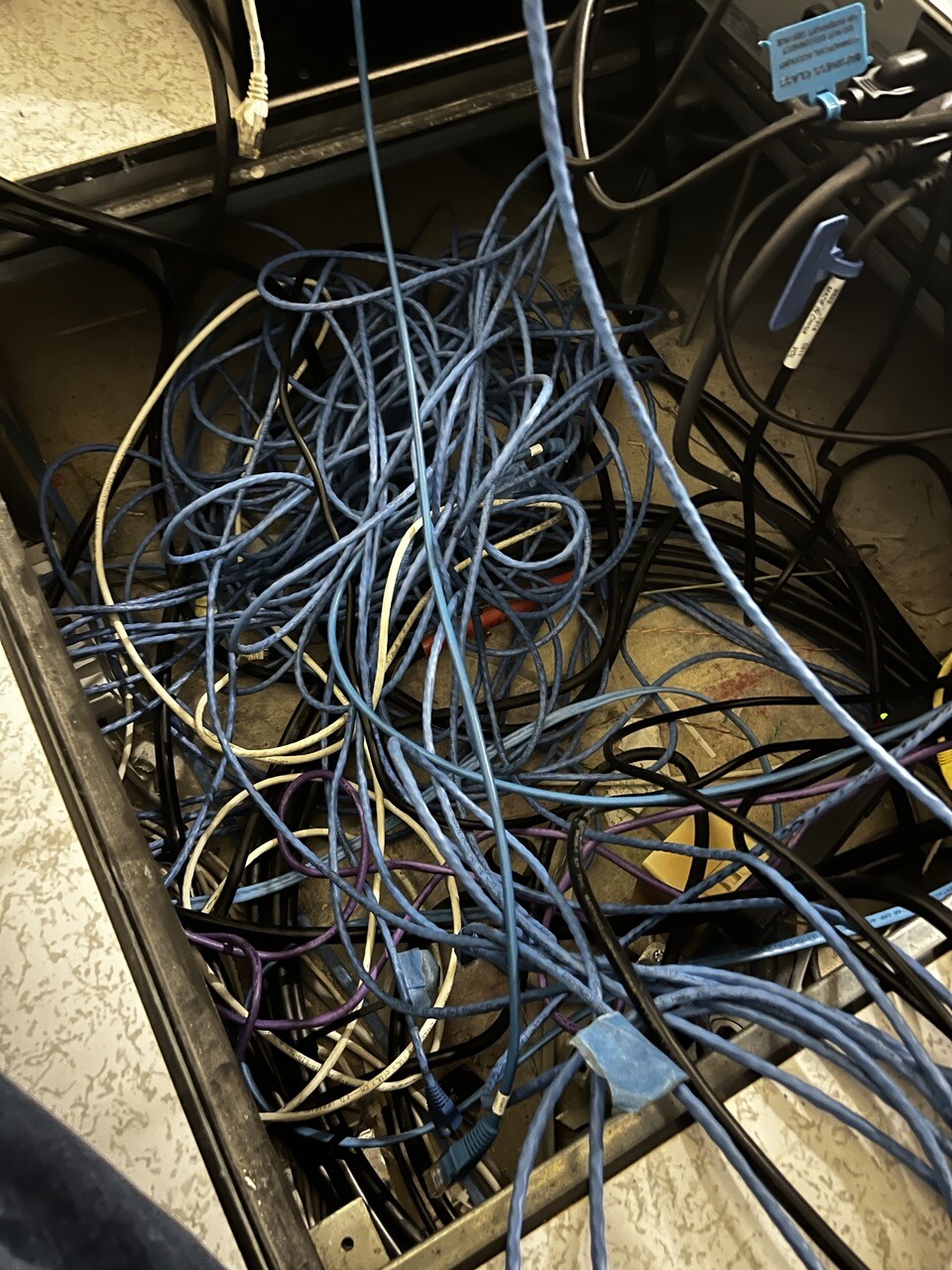 My project for today. Getting ready for some overhaul, building a newer network. Found a rat nest of wire under the floor. #untangler #edtechnerd #dialtone