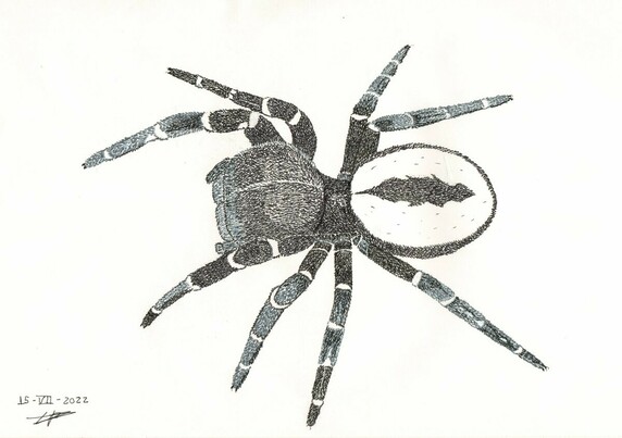 Quinto día del #dibucedario2023 y para la E, obviamente, una Eresus: mi araña favorita donde las haya. El dibujo lo hice para la asignatura de plástica y no me cansaré de compartirlo porque creo que es a lo más que puedo aspirar dibujando en plan fotorrealista.