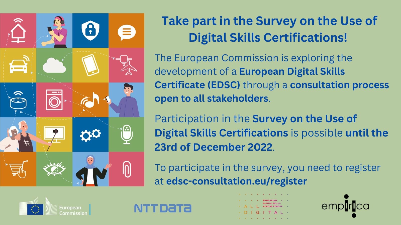Ziurtapen hau #digcomp22 esparruan oinarrituta egongo da. Gaia lantzeko, gaitasun digitalen ziurtagiriari buruzko galdetegia ireki bat jarri dute.