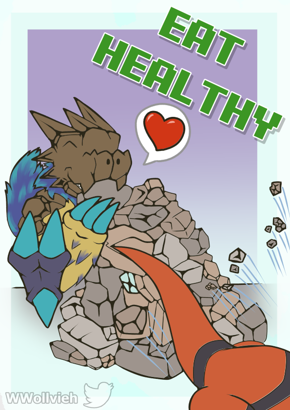 Dipsomon enjoys his fresh and healthy stones, freshly digged out for him by Guilmon. I think for most of people cleaning is not as tasty as for Dipsomon.