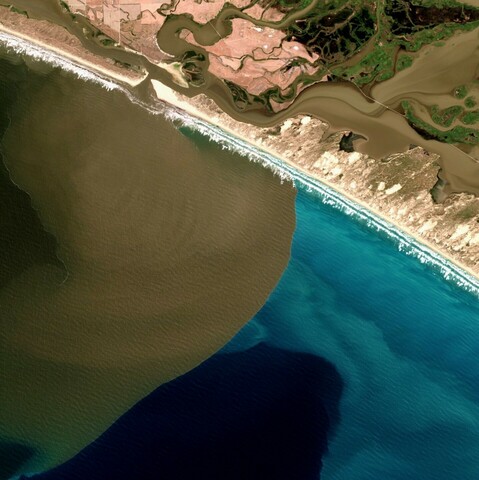 An incredible satellite view of the Murray River flood plume - thick turbid water pushing up against milky coastal and darker ocean waters offshore of the Murray Mouth in South Australia's Coorong region.