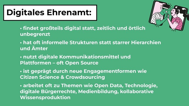 Digitales Ehrenamt – was ist das eigentlich? Bevor es losgeht, wollen wir mit euch erstmal besprechen, was darunter zu verstehen ist. Denn wenn wir gemeinsam etwas ändern wollen, braucht es ein gemeinsames Verständnis. Sagt uns gern, ob euch noch was fehlt!?