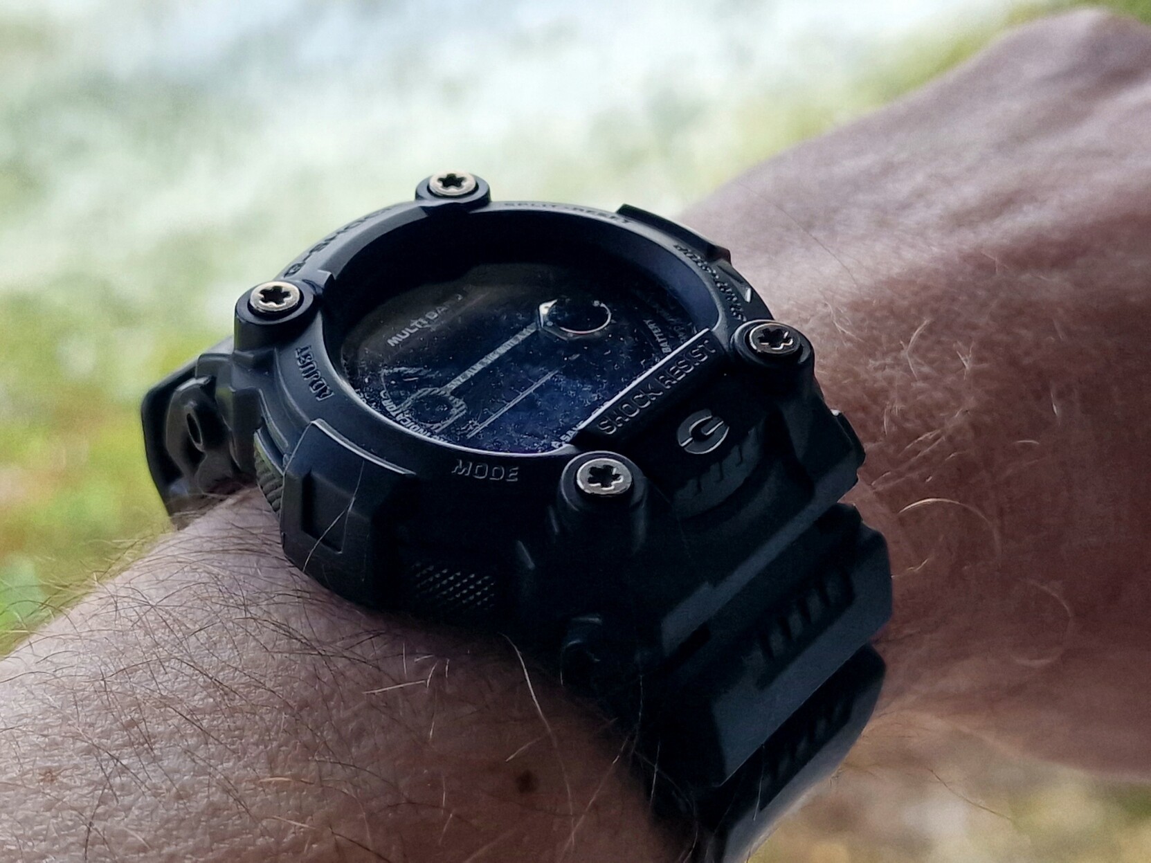 Funk-Solar G-Shock mit Zierschrauben, zusätzlich mit Mondphasen und Gezeiten Anzeige.