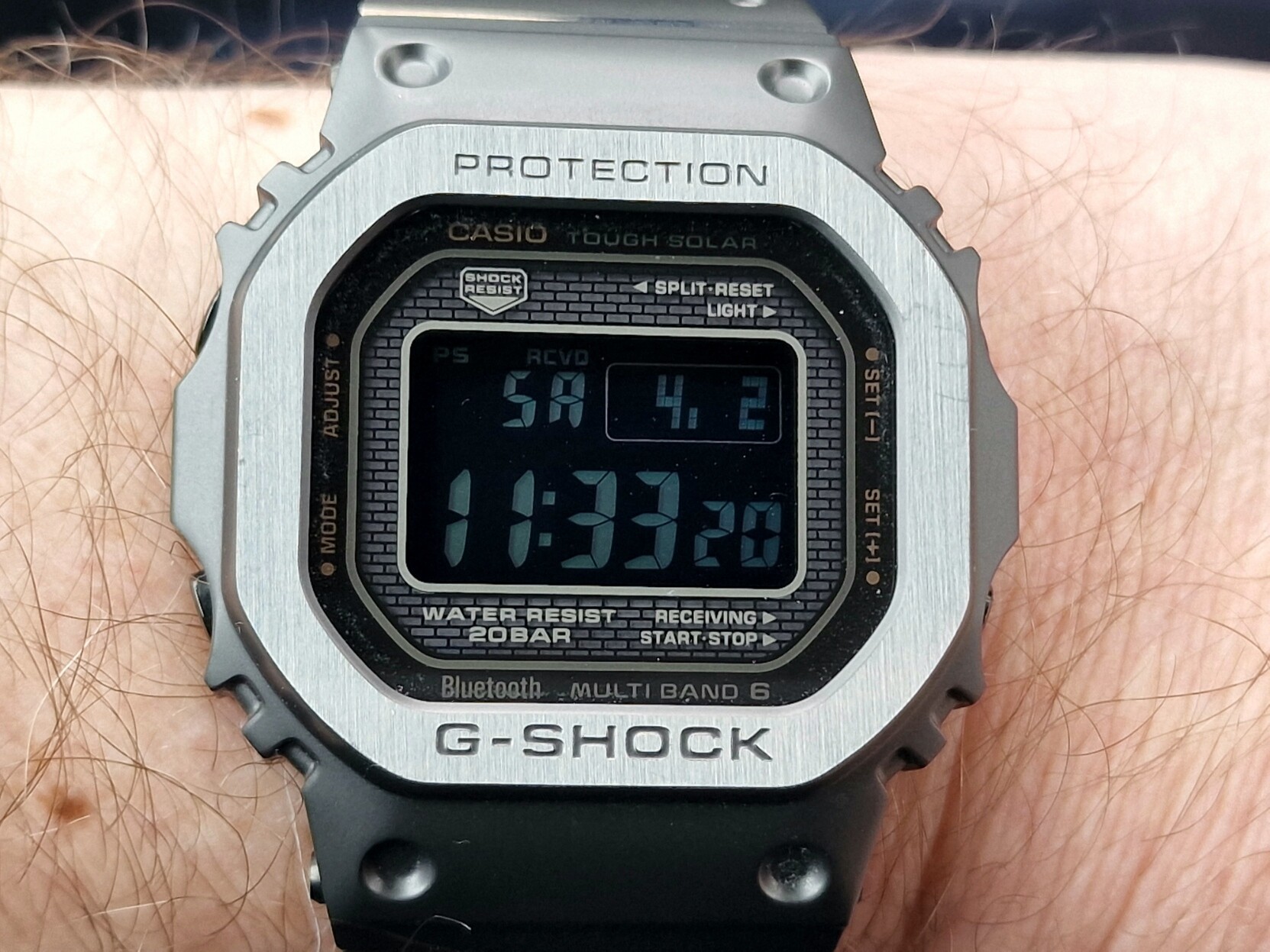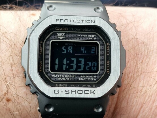 Klassische Funk-Solar #Armbanduhr, das Design ist aus dem Jahr 2000. Zu der Zeit war sie sicher eine große G-Shock, im Vergleich zu modernen Modellen wirkt sie klein. Dieses Modell erschien im Jahr 2020. Der orangene Aluminium Einsatz in der Bezel gefällt mir sehr gut.