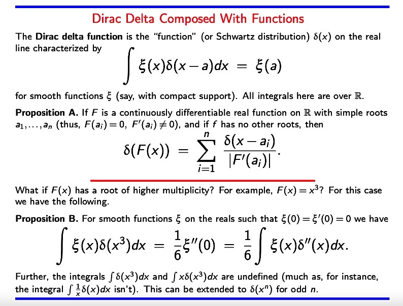 of the #Dirac delta function with other functions. Prop. A simplifies this to facilitate computations, and Prop. B is my exploring what happens with higher order zeros. N.B., here we're doing #calculus the #Physics way!