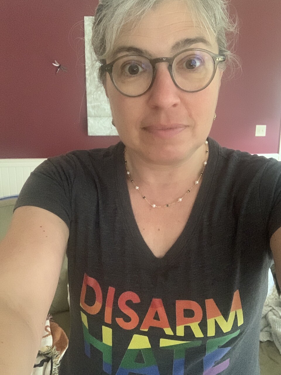 When RI @momsdemand tabled at Pride Week in Providence, I invited an attendee to join me in my message to #disarmhate by wearing my button. The answer was "Yes" and a long hug.