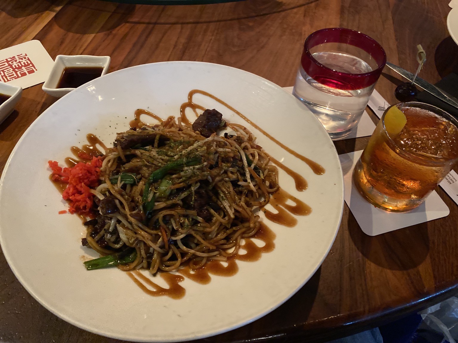 Beef Lo Mein and a Japanese Old Fashioned at Morimoto at #DisneySprings. A great start to the evening! #WaltDisneyWorld #Disney