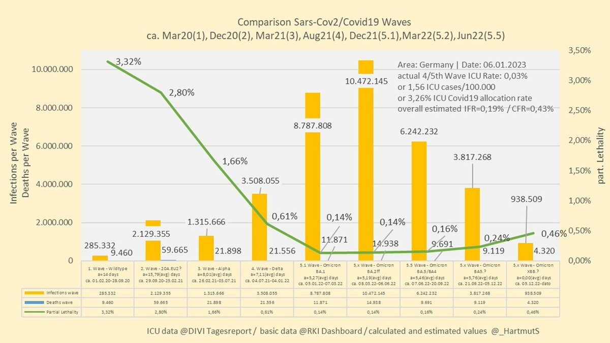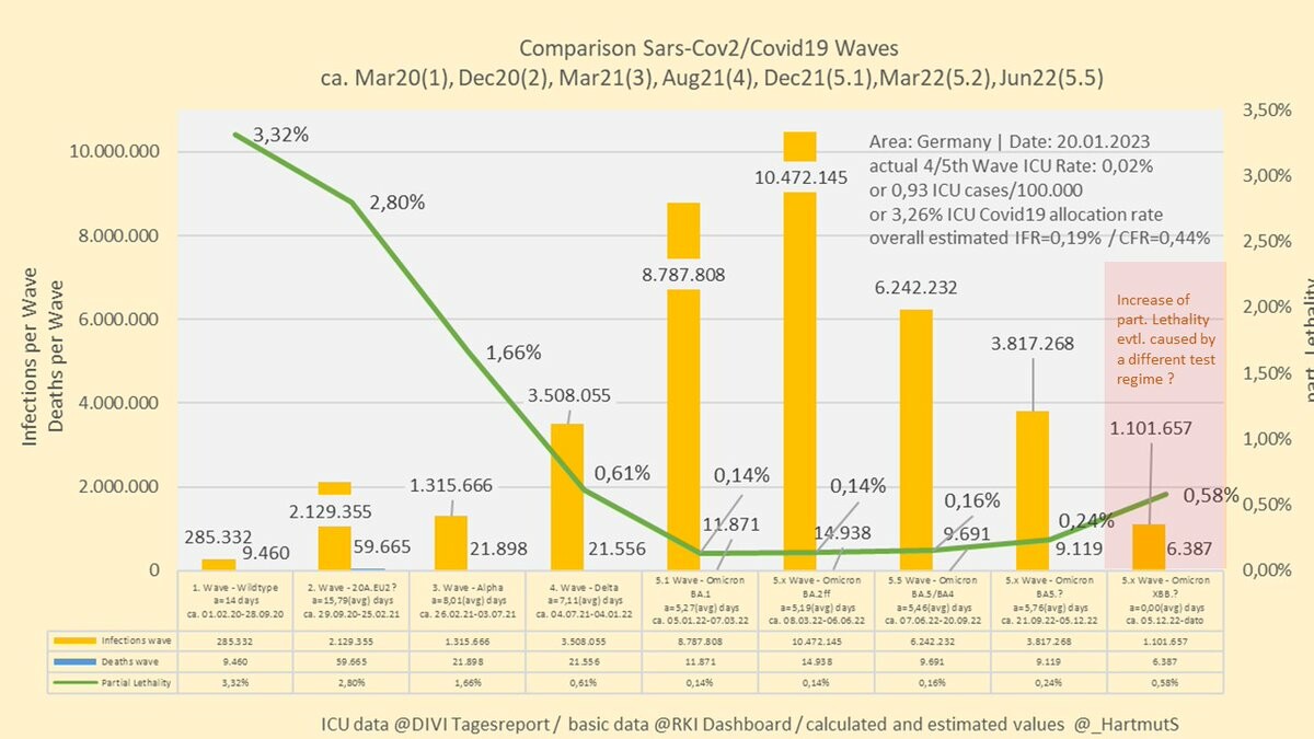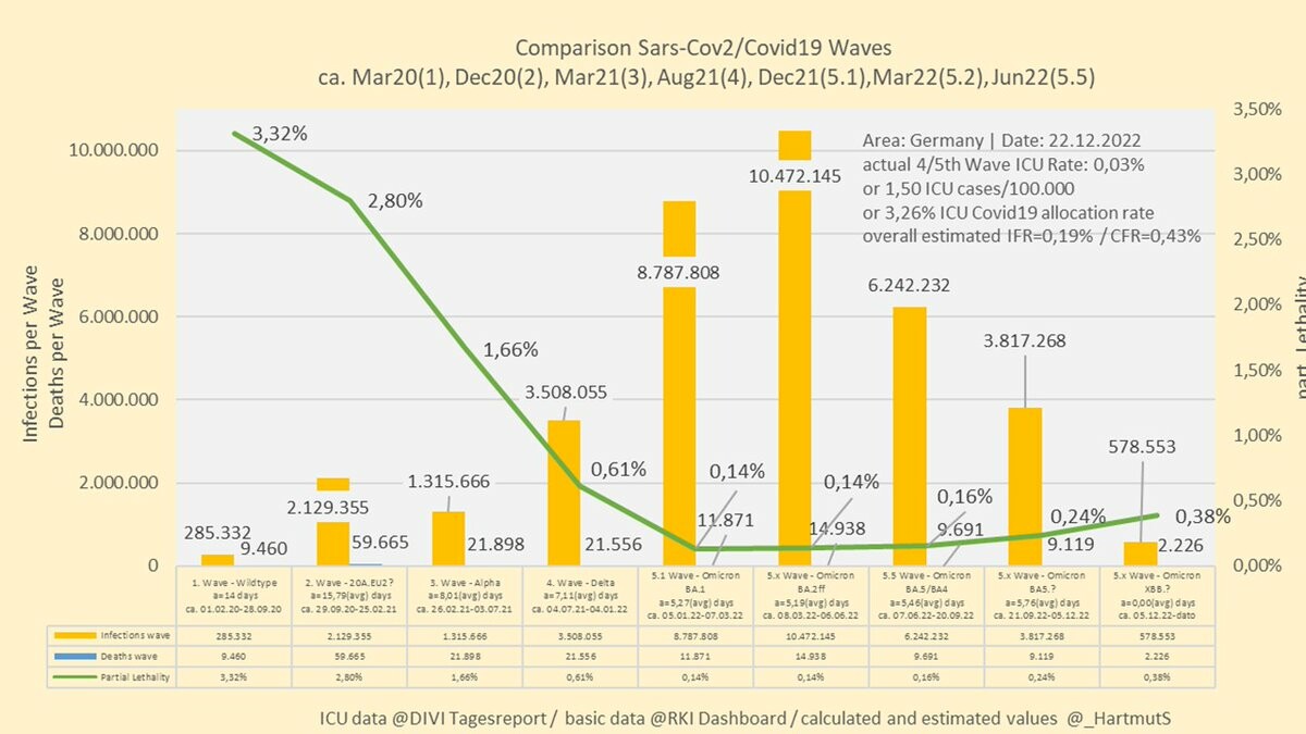 Diese zeigt die rel. maximale Covid19 ICU Belegung der einzelnen Wellen. Seit Omicron wird diese immer niedriger - aktuell 24,3% verglichen mit der 2. Welle.