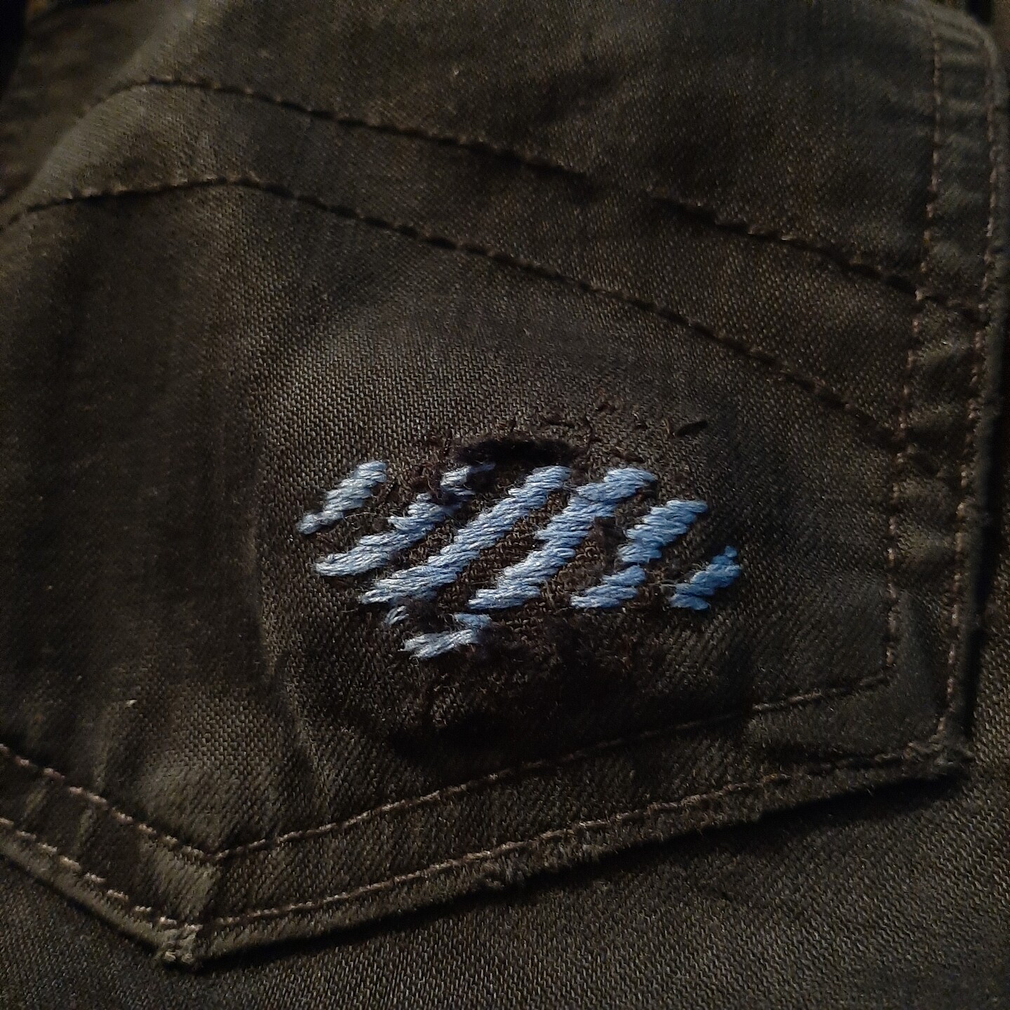 update: i embroidered over the mending because it was going to get caught on something otherwise. when i flipped the pants to take the picture i found another hole so... more patching for me!