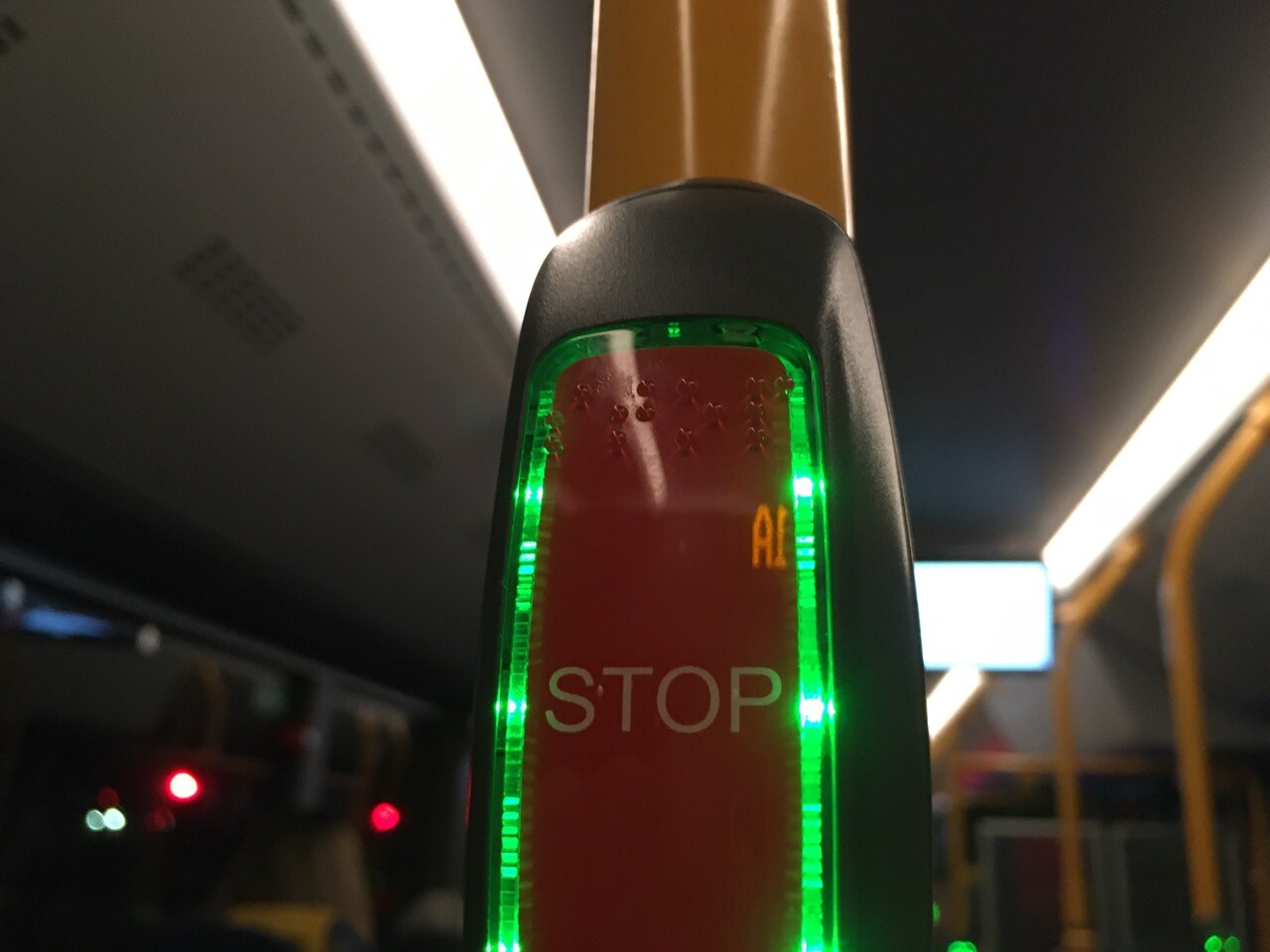 I de elektriske 1A-busser er stopknappen ikke en fysisk knap, men en berøringsfølsom overflade. Så man kan ikke læse braille-teksten uden at aktivere stop-tegnet. Og den eneste feedback er en højlydt klokke fra højttalerne. Den er forbundet med køreplanen og info-skærmene, så den virker ikke altid. #tilgængelighed #dkhandicap #dkpol