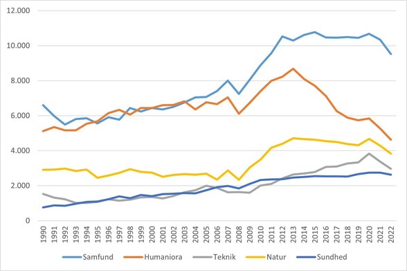 Reduktion af optaget på #dkuni er igen på dagsordenen. Se hvordan dimensioneringen af udd. allerede virker. På 10 år (2013-22) er optaget på fx humaniora i DK faldet med 47 % (rød linje) og dermed 10 % under 1990-niveau #uddpol