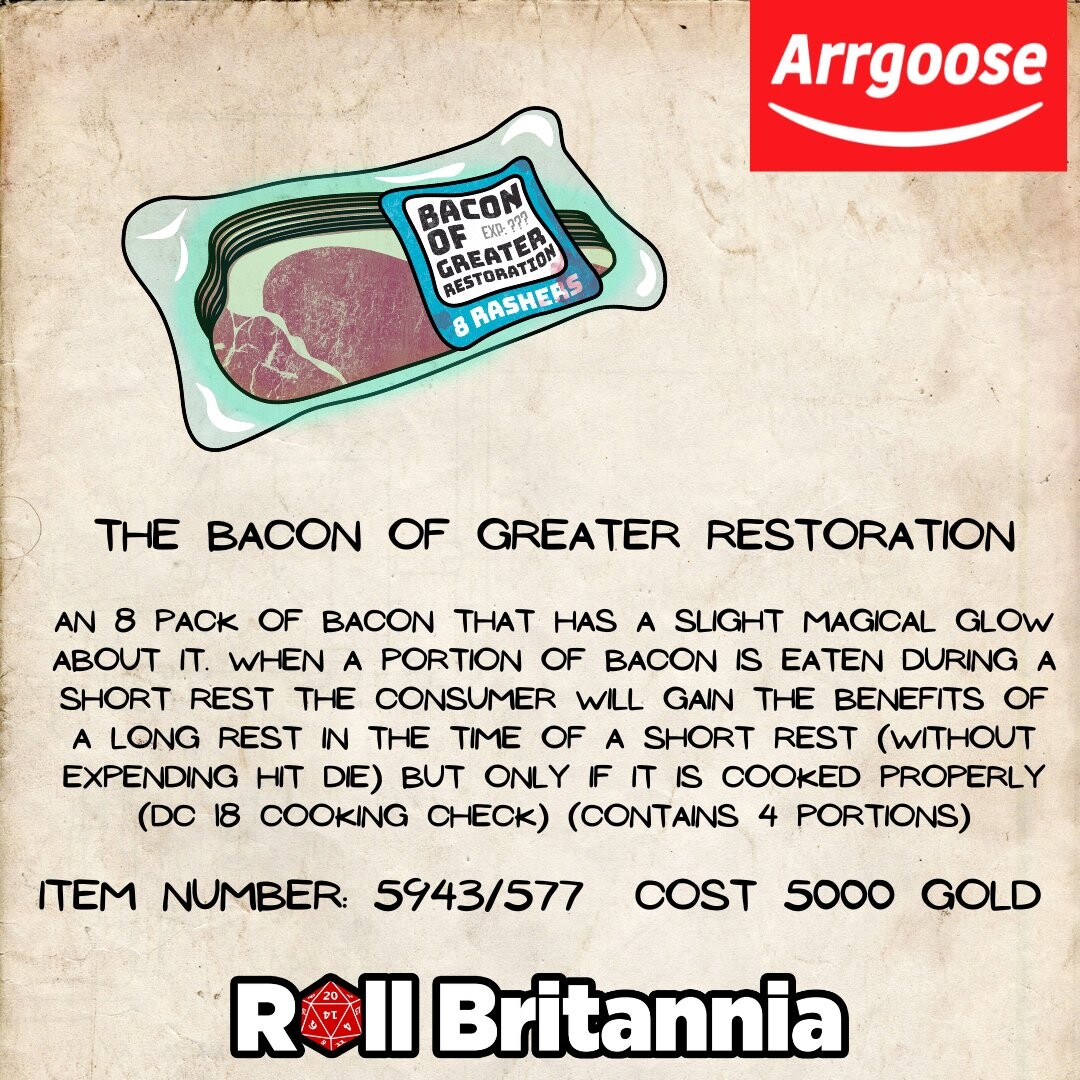 Join us as we dive deep into the Arrgoose Catalogue! This week we have the Bacon of Greater Restoration... Yummy! - Arrg-Oose