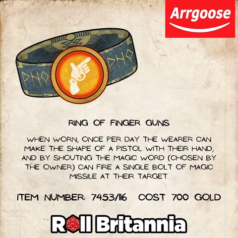 Join us as we dive deep into the Arrgoose Catalogue! This week we have Derek's ring of finger guns. PEW PEW - Arrg-Oose