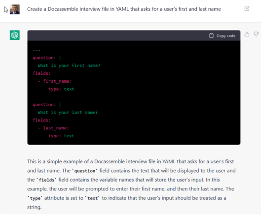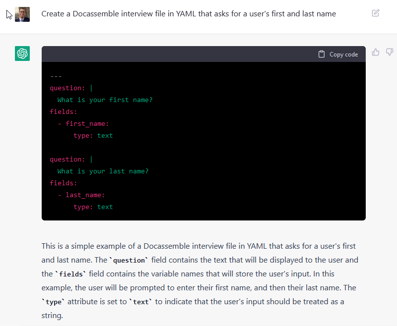 In case you were wondering, #ChatGPT is not so great at creating even simple #Docassemble interviews. Probably not enough sample code. (This interview gets several basic facts about Docassemble syntax wrong)