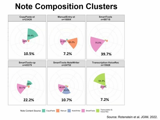 Here are 6 phenotypes of clinicians: most use smart tools (40%), some copy/paste/smarttools, and smaller 7% manually enter, and 7% use voice recognition.