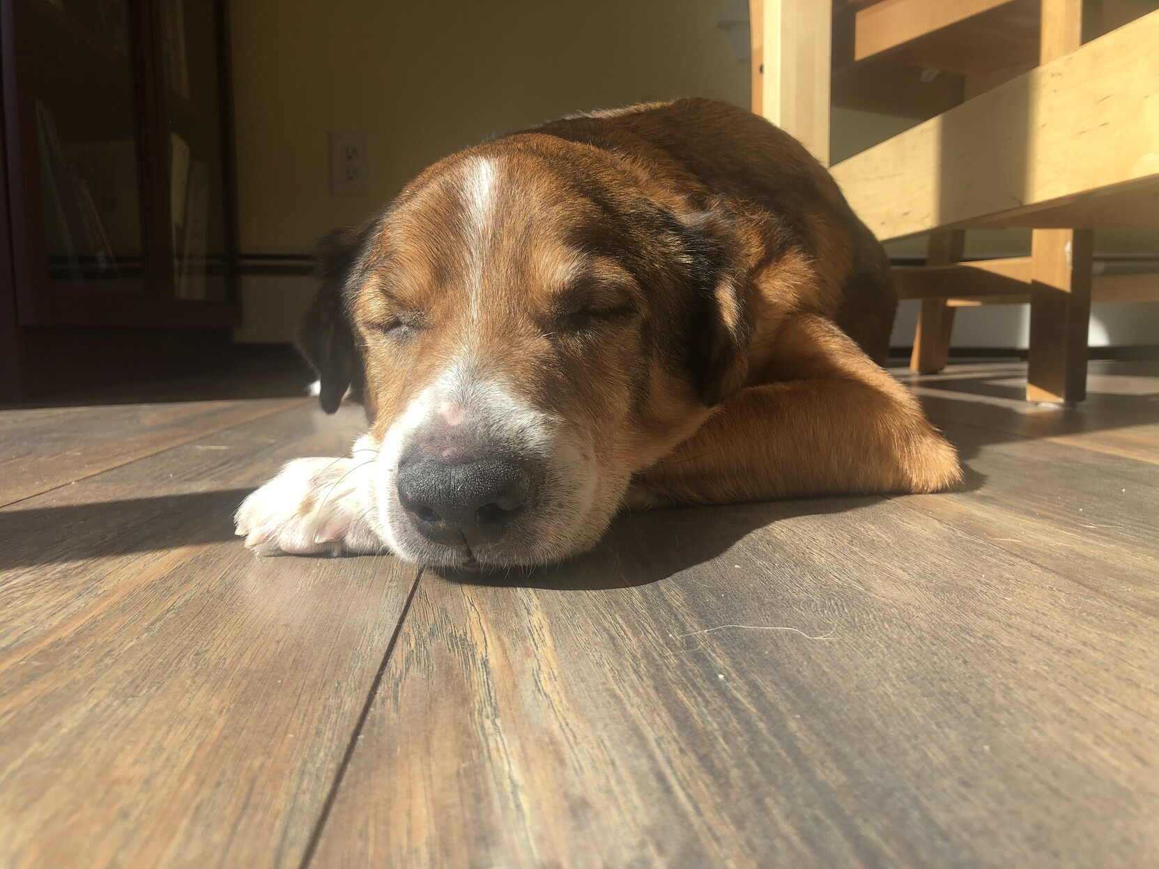 Copley is old. He has been staying awake all night because he's uncomfortable. It is nice to see him feeling warm and cozy in the sunshine. #DogsOfMaine #DogsOfMastodon #Maine #SilentSunday #SeniorDog #sleep