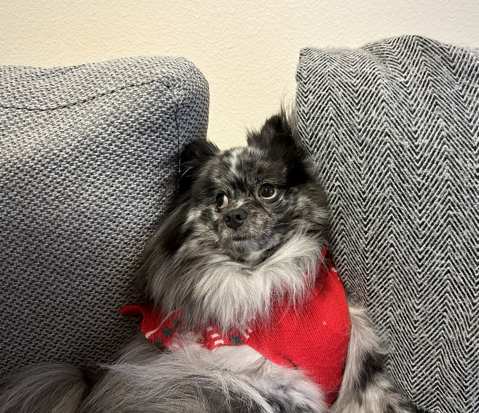 #TitanPom update: perfect camouflage sofa spot ruined by red sweater but he detects imminent human attack #DogsOfMasstodon #DogsOfBayArea