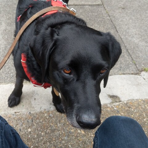 Slightly damp and pleasantly cool morning in London. Stopping for coffee with this hungry chap. #dogsofmastodan