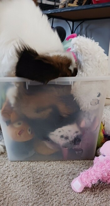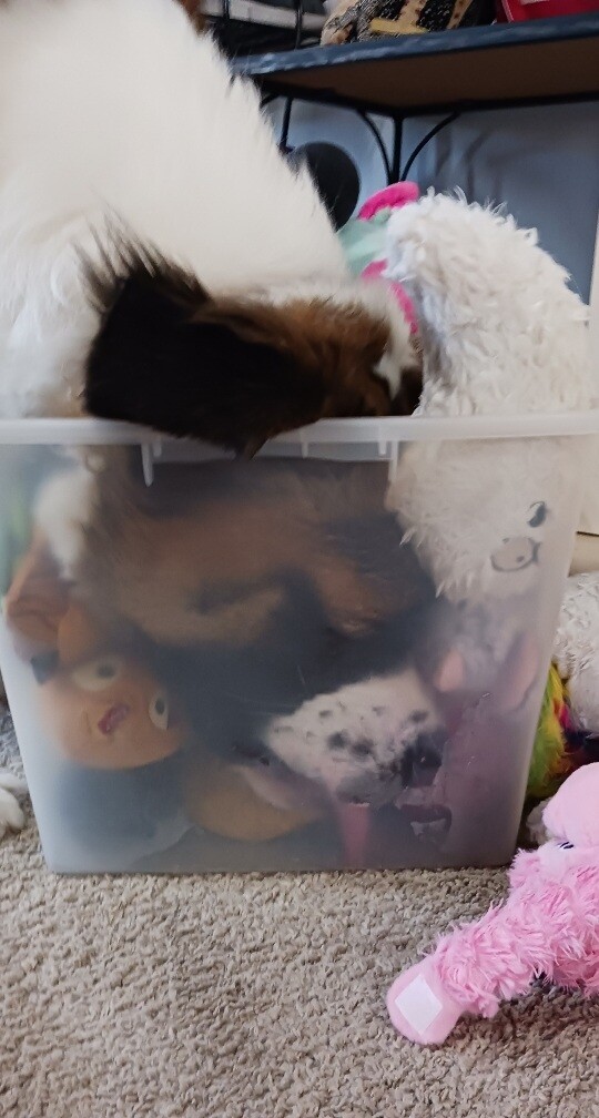 Mommy thinks she can distract me by hiding treats in my toy bo-- IZZEM TREATS WOO-HOO BRB