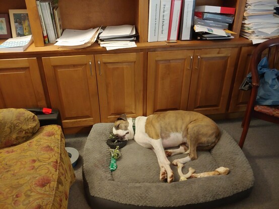 Its been a long #academic semester. My General #Psychology students presented their projects during the final period yesterday. The students took turns as presenters and participants. We floated around the room listening to the topics I can't cover in a semester. Arlo floated around, too. After 2 hours of petting (extra amounts since it was there last class with him) from students and more from petting and treats from my colleagues, Arlo took a deep nap. #dogsofmastodon #dogtoot