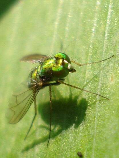 A #dolichopodid fly sits on a leaf, being beautiful.