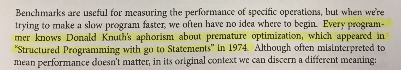 Yet we should not pass up our opportunities in that critical 3%. A good programmer will not be lulled into complacency by such reasoning, he will be wise to look carefully at the critical code; but only after that code has been identified. It is often a mistake to make a priori judgments about what parts of a program are really critical, since the universal experience of programmers who have been using measurement tools has been that their intuitive guesses fail.” #donaldknuth