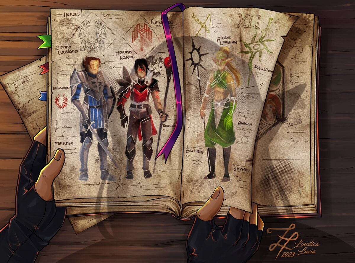 DA:D protagonist reading about the Heroes of Thedas: Ellanna Cousland, Marian Hawke and Athene Lavellan!