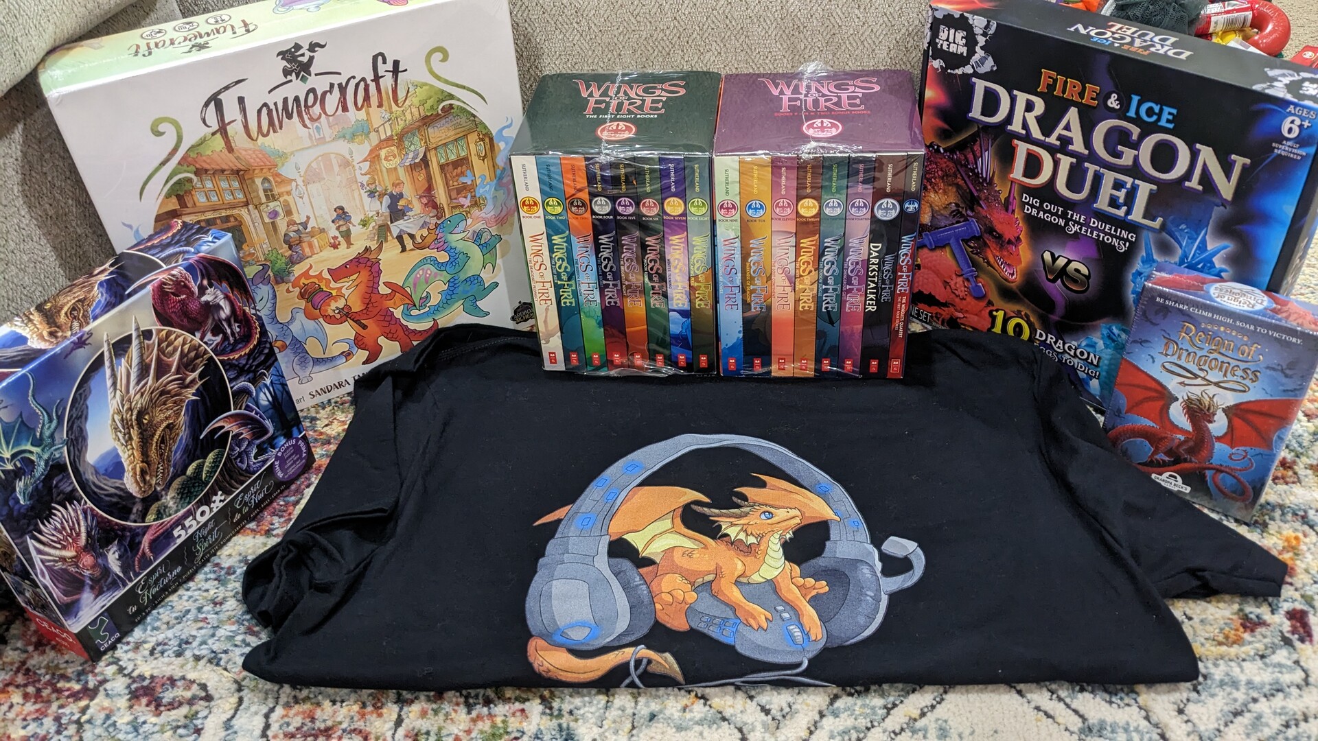 My mate knows exactly what to get me for Christmas! Highlights include Flamecraft, the Wings of Fire box set, a dragon puzzle, and a cute dragon gamer t-shirt. #dragon #dragons #christmas #otherkin #dragonkin