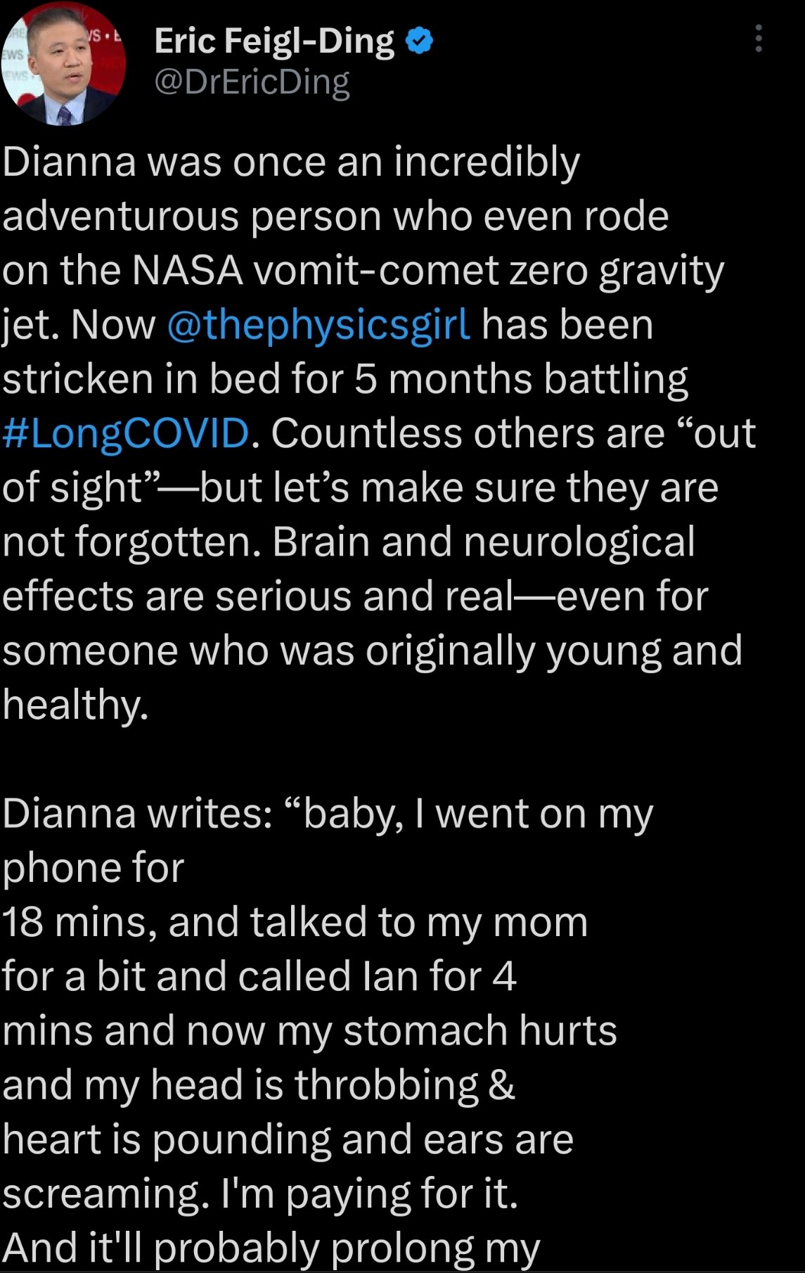 More information from #DrEricFeiglDing on #COVID19 and #LongCovid and the impacts on a healthy 20-something woman and her battle.