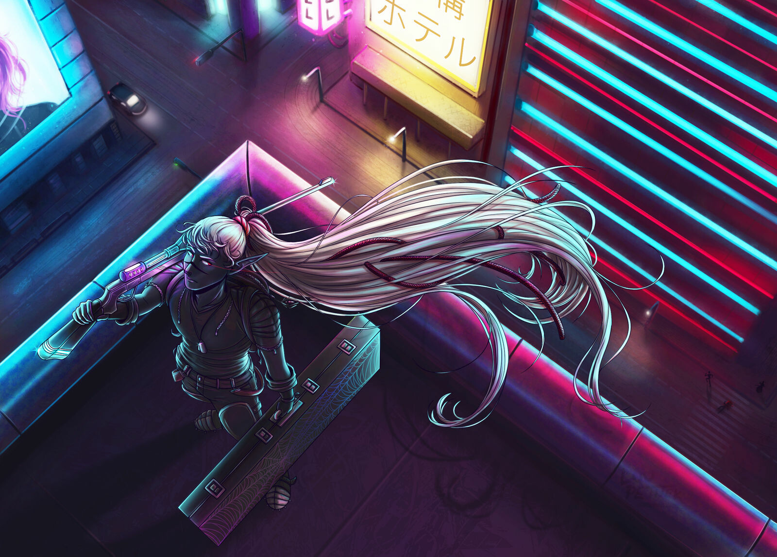Vasdorl assassinating some poor guy from a roof in a cyberpunk city, like a badass he is ๐